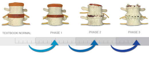 The process of degeneration of the vertebral discs causes many problems in the spine. Chiropractors work to minimise degeneration and sometimes to reverse the phases of degeneration. Inflammation can occur during any of these phases, however progressively gets worse.